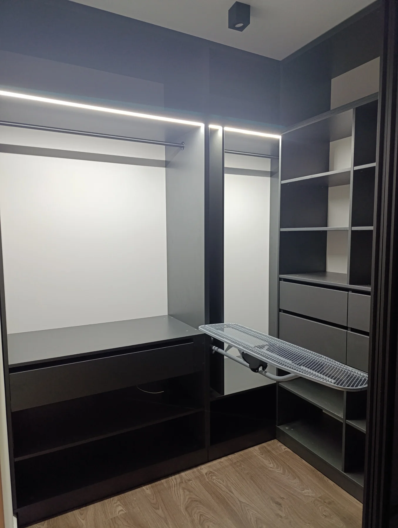 Світла, легка й повітряна — ця гардеробна у скандинавському стилі поєднує натуральні дерев'яні відтінки з білими фасадами. Виконана з ЛДСП Swiss Krono, мінімалістичними ручками та чіткою геометрією, ідеально підходить для сучасних квартир і тих, хто цінує простоту, природність і світло.