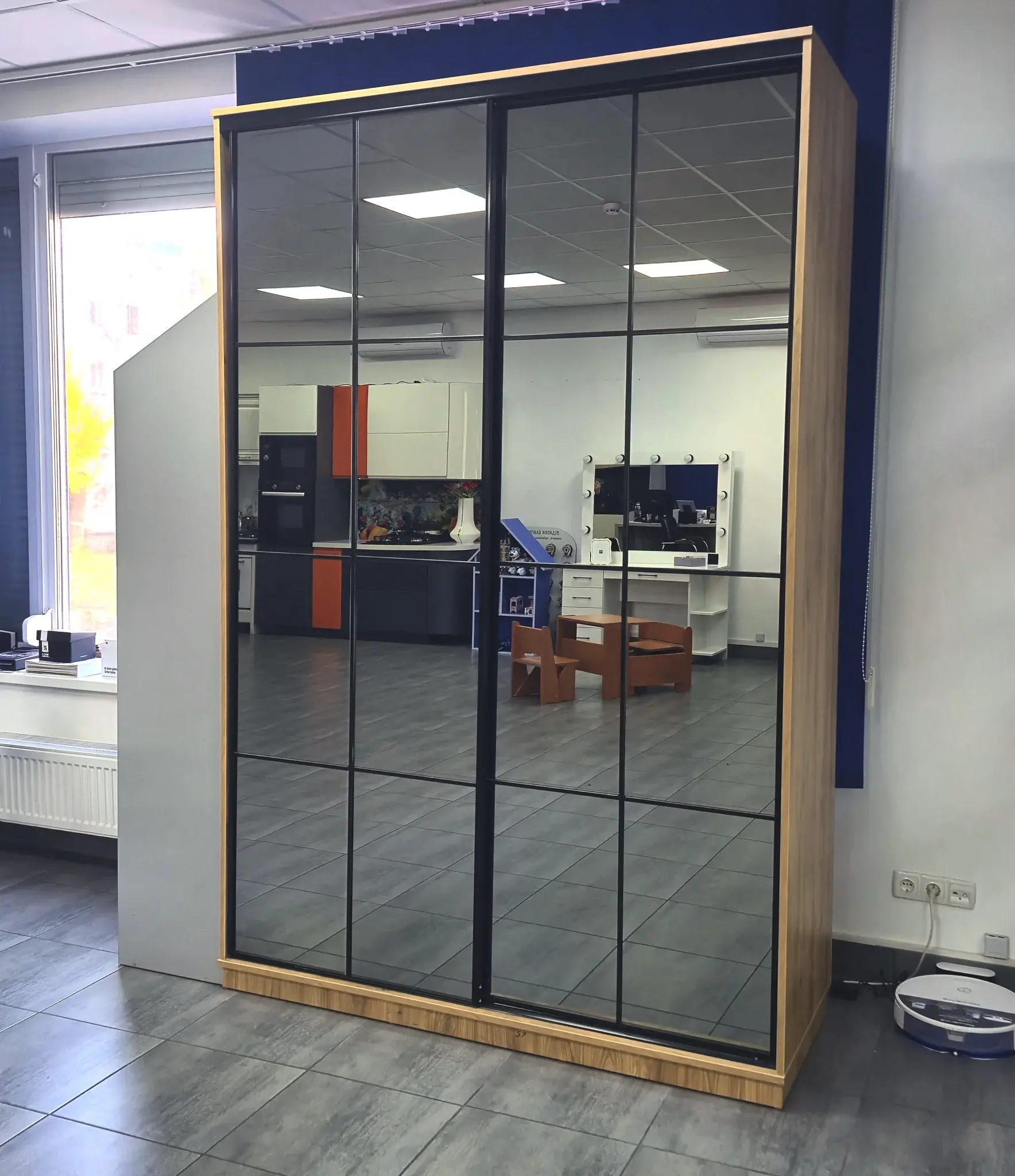 ЛДСП: Egger, Севілья. Фасади: ЛДСП, розсувна система Мойо, дзеркало-графіт.